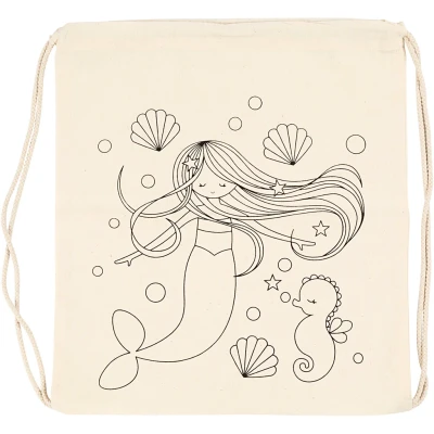 AmazonGym bag, light natural, mermaid, size 37x41 cm, 110 g, 1 pc Be creative and colourfully customise this handy gym bag, which features pre-printed motifs in black on one side. Use fabric markers in your favourite colours to make the bag unique. The bag is made of 100% cotton and has a practical drawstring closu Drawstring Bag