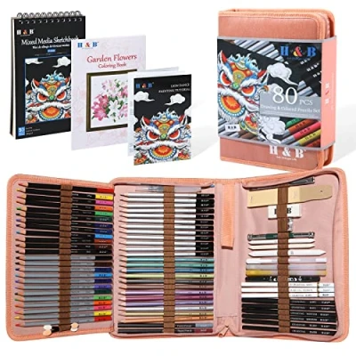 H & B 80Pcs Artist Colouring Pencils Sketching Set, Drawing Set with Book, 3 Colors Sketchbook, Art Supplies for Adults,Artists,Beginners