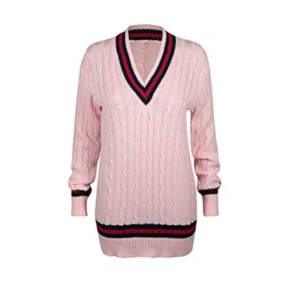 H&F ® New Women Men Unisex Long Sleeve V Neck Cable Knitted Cricket Stripe Jumper Warm Winter Wear Casual Sweater Size 16 18 20 22 24 26 (Pink, 18)