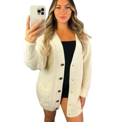 H&F New Women’s Ladies Long Sleeves Chunky Aran Cable Knitted Button Grandad Cardigan Plus Size 8 26(12 14) Cream