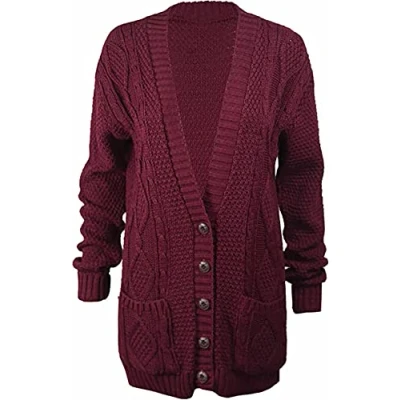 H&F New Women’s Ladies Long Sleeves Chunky Aran Cable Knitted Button Grandad Cardigan Plus Size 8 26 (12 14, Wine)