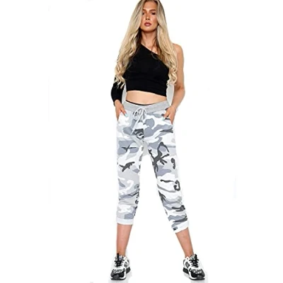 H&F ® Women’s Ladies Denim Jogger Floral, Star Printed Sweatpants Ribbed Waistband Trousers Causal Summer Drawstring Italian Gym Running Pants Size 8 10 12 14 (Grey Camo, 14)