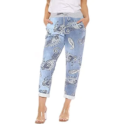 H&F ® Women’s Ladies Denim Jogger Floral, Star Printed Sweatpants Ribbed Waistband Trousers Causal Summer Drawstring Italian Gym Running Pants Size 8 22 (Cream Letters, 20 22)