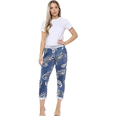 H&F ® Women’s Ladies Denim Jogger Floral, Star Printed Sweatpants Ribbed Waistband Trousers Causal Summer Drawstring Italian Gym Running Pants Size 8 22 (Denim Stone Big 16 18)