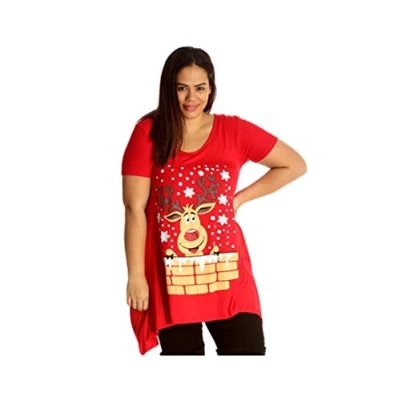 H&F ® Women’s Ladies Short Sleeve Round Neck Snowflake Reindeer Hanky Xmas Top Rudolph Christmas Print T Shirt Sizes 14 16 18 20 22 24 26 28 Red