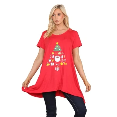 H&F ® Women’s Ladies Short Sleeve Round Neck Snowflake Reindeer Hanky Xmas Top Rudolph Christmas Print T Shirt Sizes 14 16 18 20 22 24 26 28 (Red Decoration Tree, 14)