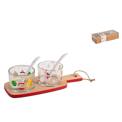 Make your dinner and Christmas party with this handy kitchen set. Elegant and modern design - no more boring appetizers or aperitifs Ideal for serving dips of all kinds, but also for small appetizers and intake cakes. The pack contains 2 cups with Christmas ornaments made of glass, small spoons and a bamboo base that is very simple yet sophisticated. The base has small recesses in the shape of the cups to ensure the set is stable and a handle ensures easy handling. Dishwasher safe bamboo bowls for rinsing with water Base size is 28cm x 8cm, cup size is 7cm
