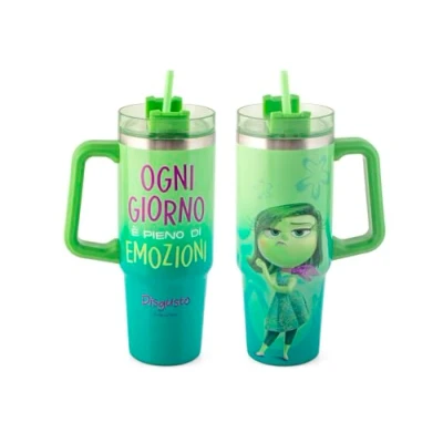 THERMAL DESIGN: 18/10 stainless steel tumbler with 0.90L capacity, equipped with anti-condensation system to keep drinks at the desired temperature PREMIUM MATERIALS: Constructed of high quality stainless steel, with clear lid and integrated straw in matching green PRACTICAL FEATURES: Modern design with ergonomic handle, ideal for both hot and cold drinks, fully dishwasher safe OPTIMAL SIZE: Measures 8.5 cm wide by 12 cm high, perfect for everyday use and easily portable ARTISTIC DESIGN: Decorated with thematic graphics and motivational lettering in Italian, made in vibrant green and turquoise colours
