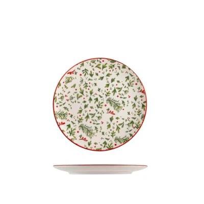 An enchanting pattern of red holly berries and pine twigs evoking a joyful and luminous ethmosphere. These plates are ideal for adding a traditional and festive touch to your party mise en place Made of ceramic Dishwasher and microwave safe