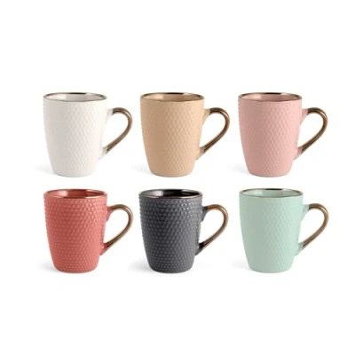 These mugs are made from stoneware, in assorted delicate pastel colours The bronze effect on the handles and edges gives rise to fascinating play of reflections that beautify the collection Mugs are dishwasher safe and microwave safe Great gift idea