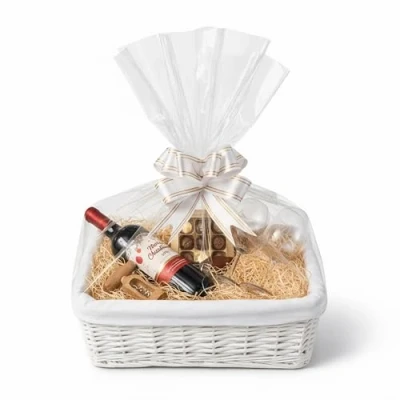 1 x Make your own hamper kit, Colour: White wicker Each kit includes: a wicker basket with removable lining, natural wood shreds, cellophane and 1 bow for decoration. GIFTS NOT INCLUDED. Create a thoughtful gift for any occasion. Fill the hamper with wood shreds and your gifts. Finish by wrapping in cellophane and adding a bow. Size: Medium: W 36 x L 25 x H 15 cm approx. Please note all sizes are approximate. Image for illustration purposes only, contents not included, colour may vary slightly.