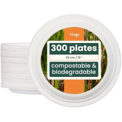Full 26 cm dinner size, value 300-pack – Large round plates at true 10" dinner size, ideal for mains, buffet spreads, pizza slices and loaded BBQ plates. Fits standard chargers and plate holders for parties and catering. Strong, grease- & leak-proof – Made from rigid sugarcane (bagasse) with a sturdy rim for extra strength. Naturally cut-, grease- and leak-resistant so saucy, oily or juicy dishes don’t sag the plate or soak through. Microwave-safe for reheating – Plates can be used to gently reheat food in the microwave: tested up to 130°C for 4 minutes or 150°C for 3 minutes. Not suitable for oven or grill functions. Classic white, clean event look – Crisp white finish for a polished, modern table setting that suits any theme (weddings, birthdays, catering, everyday meals) and pairs easily with coloured napkins, décor and servingware. Home-compostable & plastic-free – 100% plant-based plates made from renewable sugarcane fibre with no PE or wax lining. Biodegradable and home-compostable, ideal for birthdays, weddings, school events, BBQs, picnics, buffets and street-food stalls., Manufacturer: HAAGO