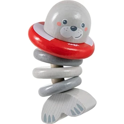 The rattle seal figure from HABA is an animal-cute motor skills toy made of wood for babies from 6 months to grip, shake and play The cute seal is made of sturdy beech wood, the movable elements are held together by a tear-resistant elastic band, length 10.5 cm The grasping toy can be easily held by small hands, shake and explore; HABA baby toy can also be put in the mouth The wooden toy from sustainable forestry occupies baby's senses and promotes the hand motor skills of small explorers The handy HABA rattling figure seal fits in any bag, provides variety on the go and is great as a gift for girls and boys, Manufacturer: HABA