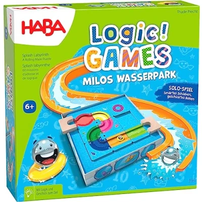 Giant sliding fun with the HABA game: Logic! GAMES - Milos Water Park Tricky logic game from 6 years with 3D game construction and robust game material 60 tasks with increasing difficulty ensure huge puzzle fun with the sliding puzzle from HABA Each round creates a new water slide, dimensions box 26.5 x 26.5 cm This variable ball maze trains spatial and logical thinking, Manufacturer: HABA