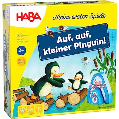 Early board game fun: 'Auf, auf Kleiner Penguin' is a dice-loving game for children aged 2 and up - ideal for first play experiences in the nursery. Wooden figures for small hands: six robust penguin figures made of wood, perfectly grippy and attractively designed for long-lasting fun. Strengthen teamwork: Penguin mum and baby form a team - players roll the dice to gradually overcome tree trunks and stones and reach the fish. High-quality material: robust play material made of sturdy cardboard and wood - suitable for intensive play use and safe for small children's hands. Ideal gift: a cute and lightning-fast board game for 2 to 4 small players - increases concentration and understanding of rules, playing time 5-10 minutes., Manufacturer: HABA