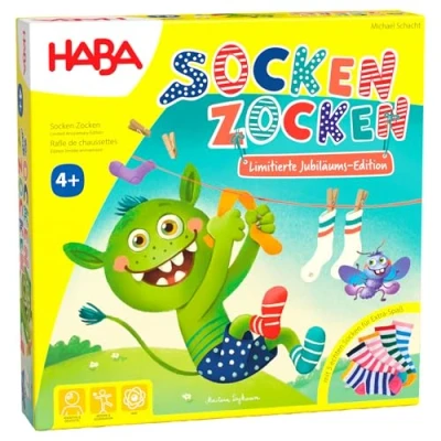 LIMITED ANNIVERSARY EDITION: Celebrate the 20th anniversary of Socks Gambling with a special edition that includes real socks and special extras. Hand socks challenge: for even more fun, players put socks over their hands to increase the challenge. Fast playing fun: simple rules allow quick and easy entry for children and families. FOR THE WHOLE FAMILY: Suitable for 2-5 players, all play at the same time and try to find the most pairs without catching holey socks. High-quality materials: contains sock monster and moth toy figures made of robust wood, as well as colourful fabric socks and sock plates., Manufacturer: HABA