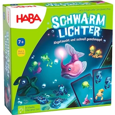 Fast-paced show-accurate game from 7 years with exciting dives - swarm lights from HABA Search game for 2 to 5 children, playing time approx. 15 minutes, box dimensions: 15.3 x 15.3 x 4.9 cm Dive and quickly find the diced sea creatures; whoever has the fewest minus points wins. Robust playing material made of sturdy cardboard with iridescent cards - great gloss effect! HABA Children's game in a magnificent deep sea atmosphere for little animal lovers and adventurers, Manufacturer: HABA
