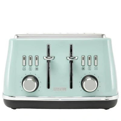 The Haden Cotswold 4 Slice Toaster in Sage Green features extra wide slots, dual independent controls, and multiple browning settings, all in a stylish textured design with chrome accents—perfect for busy kitchens wanting reliable performance and countryside-inspired charm. Includes defrost, reheat, and easy-clean crumb trays.