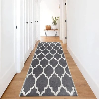 Hafaa Carpet Runners for Hallway Non Slip 80 x 150 cm Trellis Pattern Printed Design Bedroom Grey and White Bedside Carpets Kitchen, Lounge (AVA Grey)