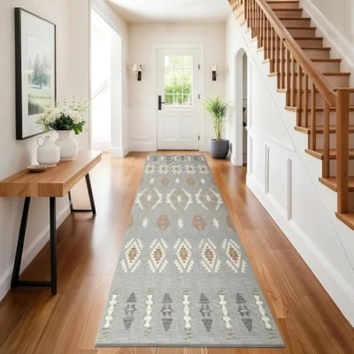 Hafaa Carpet Runners for Living room Grey Runner Rugs Hallway Non Slip long 80 x 300 cm Geometric Style Tribal Pattern Modern Low Pile Bedroom (NOVA)