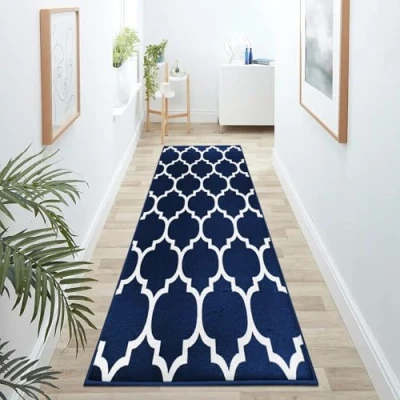 Hafaa Navy Blue Runner Rugs for Hallway Non Slip Trellis Pattern Carpet living room 60 x 220 cm Printed Carpets Lounge Office Bedroom (AVA NAVY)
