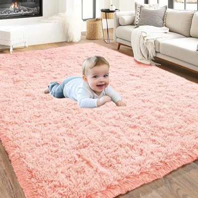 Hafaa Rugs Living Room Large 160x230 cm Fluffy Shaggy Pink Area for Bedroom Non Slip Modern Super Soft Thick Pile Plush Carpet Shedding Easy To Clean Rug