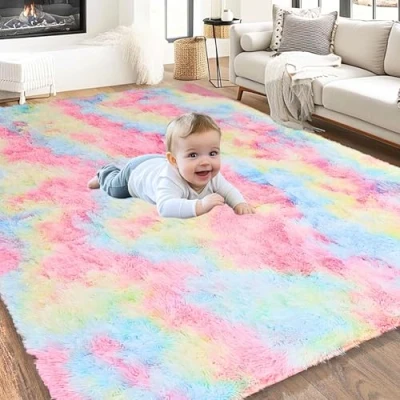 Hafaa Rugs Living Room Large 160x230 cm Fluffy Shaggy Rainbow Area for Bedroom Non Slip Modern Super Soft Thick Pile Plush Carpet Shedding Easy To Clean Rug