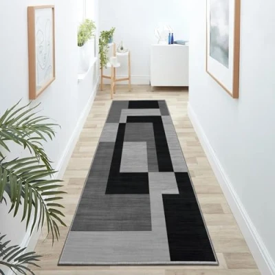 Hafaa Runner Rugs for Hallway Non Slip Geometric Pattern Carpet living room 60 x 220 cm Printed Black and Grey Carpets Lounge Office Bedroom (Milo Grey)