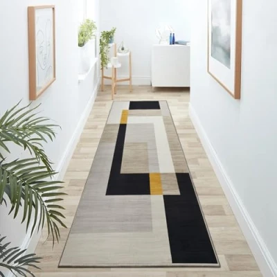 Hafaa Runner Rugs for Hallway Non Slip Geometric Pattern Carpet living room 60 x 220 cm Printed Black and Yellow Carpets Lounge Office Bedroom (Milo)