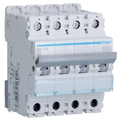 INTER MAGNETO 4P 25A CURVE B 6/10KA MBA425 Magnetic Thermal Circuit Switch, Model No.: MBA425 Hager is synonymous with technological innovation, high-quality products and attractive design., Manufacturer: Hager