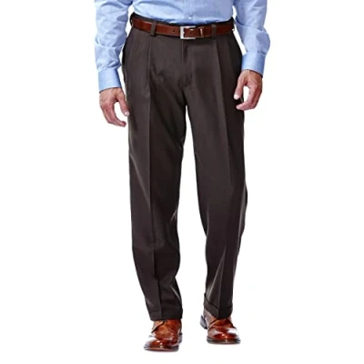 Pleated pant with hidden stretchy waistband and French button fly Slant pockets and full back welt pockets Haggar eCLo products made from Repreve recycled fibres from Unifi