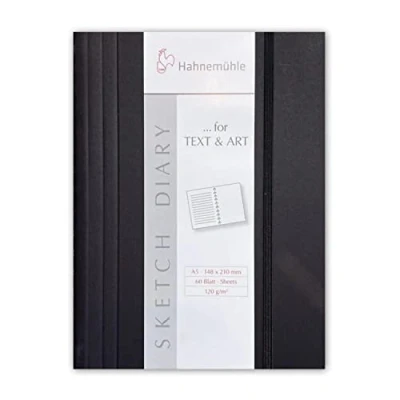 Hahnemühle Sketch Diary – Black Cover. Capture your creativity and daily thoughts in one stylish place with the Hahnemühle Sketch Diary. This unique hybrid combines the freedom of a sketchbook with the structure of a journal, making it perfect for artists, writers, and creatives of all kinds.. Dual-Purpose Design: Alternating pages for sketching and note-taking – ideal for documenting ideas and illustrations together.. Premium Paper: 140gsm acid-free, natural white paper suitable for pencil, ink, charcoal, and light watercolour.. Elegant & Durable: Black hardback cover provides protection and a sleek, professional appearance.. Built-In Extras: Includes a handy storage pocket and elastic closure for securing loose notes or materials.. Perfect On-the-Go: Compact and travel-ready, great for use at home, in the studio, or outdoors.. Whether you're an urban sketcher, a diary writer, or a creative professional, the Hahnemühle Sketch Diary offers a versatile and inspiring format to express yourself every day.