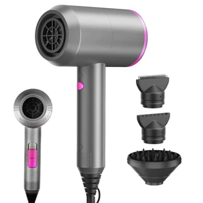 Professional Hair Dryer - 2000W AC power supply provides strong wind, which can dry hair quickly. With 2 speeds (high/low) and 3 heating settings (hot/warm/cold)(83.3/66.7/38.9℃), it can provide constant temperature protection, quickly control the temperature, can strengthen the care of the hair, and reduce the heat damage to the hair. Negative Ions Hair Care - Built-in negative ion generator releases high concentration of negative ions to the surface of the hair, so that the hair is not frizzy, the roots are deeply moisturized, and the hair is smooth and shiny. 2 Nozzles & 1 Diffuser - Nozzles can direct and focus the air output during styling to control frizz and style outcome. You can also choose to straighten your hair or form a soft wave. The use of a diffuser in a low temperature environment will release a gentle, indirect stream of warm air, which can better effect of curls and styling, Ideal for those with curly and wavy hair textures. Perfect Design & Safe - Hair Dryer Adopts geometric aesthetic design, comfortable dryer holding experience, gentle and soft touch boby. This is a stylish hair dryer. Hair dryer adopts anti-leakage and excessive protection safety plug, so you and your family can use it safely at any time. Small & Portable - Our Hair dryer is a light weight salon hair blow dryer with seamless handle, comfortable to hold, not tiring, and easy to carry when traveling. Suitable for ladies, Pregnant,the elderly and children. Ideal for personal use and gifts.
