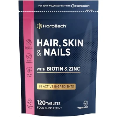 ADVANCED HAIR SKIN AND NAILS BLEND: Our Hair, Skin & Nails tablets are expertly formulated with Biotin, Zinc, and Selenium - a trio of well-known nutrients often included in daily beauty and wellness routines. 28 VITAMINS & MINERALS: This unique blend combines 28 vitamins & minerals, offering a convenient way to complement your daily routine. CONVENIENT: No need to re-order every month - our one-a-day formula provides over 4 months of use in just one pouch. SUITABLE FOR: Horbaach Hair, Skin & Nails tablets are suitable for vegetarians and offer the perfect formula for adult men and women at the best value. PACKAGING MAY VARY: We are in the process of updating our packaging. If the product you receive appears different, please rest assured that the benefits remain the same.