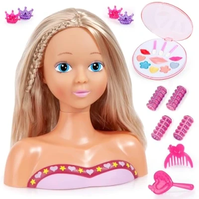Hairdressing head approx. 27 cm with beautiful long blond hair Including lots of hair accessories like hair clips, curlers, brush, comb With colourful make-up to create a glamour look With stickers for even more fun Hairdressing head to try new styes and to be creative, Manufacturer: Bayer Design