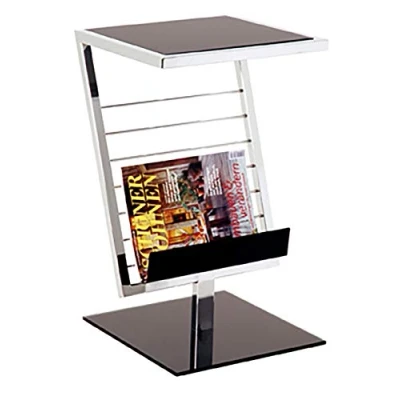 Made of chrome steel tubing Safety glass shelf painted black with newspaper rack Black lacquered safety glass base