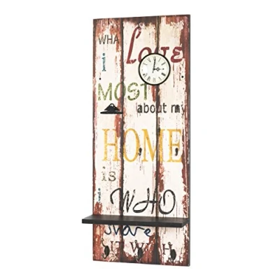Made of MDF with vintage look lettering “Home” with shelf in black with integrated clock with 5 key hooks, 3 coat hooks and a metal clip