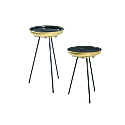 AmazonFrame made of steel tube painted in black Metal shelves painted in black and gold Small table dimensions: Ø 38 x H 56 cm Large table dimensions: Ø 38 x H 66 cm Load capacity: 8 kg/5 kg