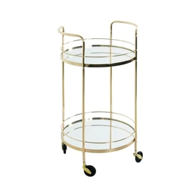 Made of brass-plated steel tubing Frame made of flat steel, brass-plated Shelves made of mirror glass/diameter 42 cm Maximum load: 8 kg per shelf / intermediate heights 14/47 cm On wheels