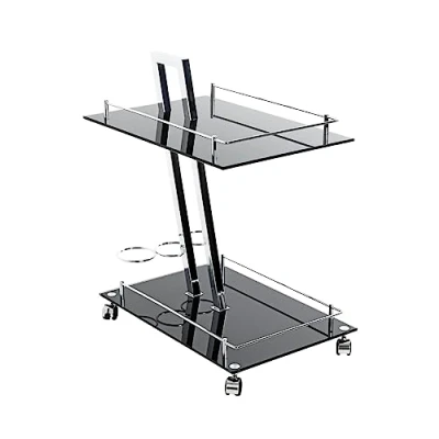 Made of chrome steel tubing with integrated bottle holder Safety glass shelves painted black on wheels Load capacity: 15 kg
