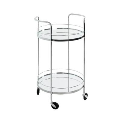 Made of steel tube in chrome Frame made of flat steel in chrome Shelves made of mirror glass/diameter 42 cm Maximum load: 8 kg per shelf / intermediate heights 14/47 cm On wheels