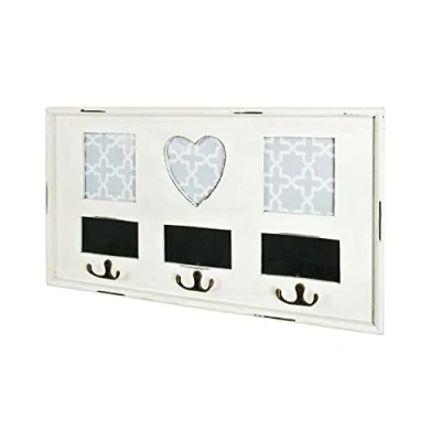 Made of solid wood/MDF painted in antique white with 3 coat hooks with recessed picture frame with labelling option mounted