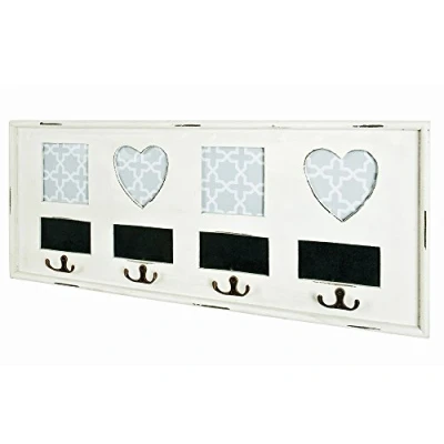 Made of solid wood/MDF painted in antique white with 4 coat hooks with recessed picture frame with labelling option mounted
