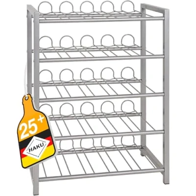 Made of steel tubing painted in aluminum with 5 shelves for approx. 45 bottles of 1.5L