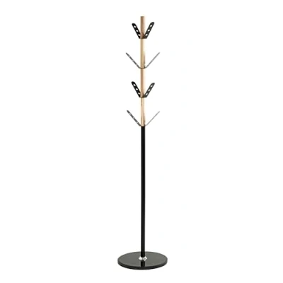 Made of black powder-coated steel tube Natural solid wood 8 metal coat hooks in black powder-coated Marble base plate Ø 37 cm in black Load capacity: 6 kg per hook