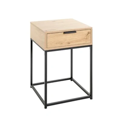 Made of steel tube in black powder-coated Body and drawer made of chipboard Scratch-proof, water-repellent, UV-resistant With light oak decor with colour accents With tilt protection, load capacity: 15 kg