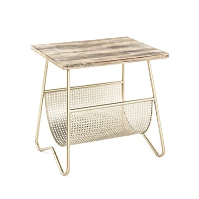 Frame made of steel tube painted in matt gold with integrated newspaper rack Top shelf made of MDF with natural wood veneer mounted