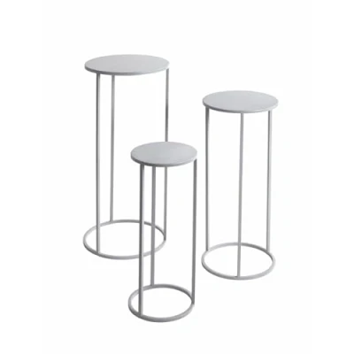 Made of steel tube in powder-coated grey Shelves made of metal in powder-coated grey Diameter of shelves: 30/25/20 x H 70/60/50 cm Suitable for outdoor use in covered areas Load capacity: 5 kg per shelf, assembled