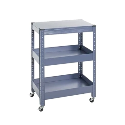 Made of metal, powder-coated in blue Height-adjustable shelves, compartment size: 49.5x31.5x5.5 cm On wheels, 2 rolls can be locked Load capacity: 10 kg per shelf