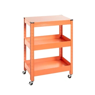 Made of powder-coated metal in orange Height-adjustable shelves, compartment size: 49.5x31.5x5.5 cm On wheels, 2 rolls can be locked Load capacity: 10 kg per shelf